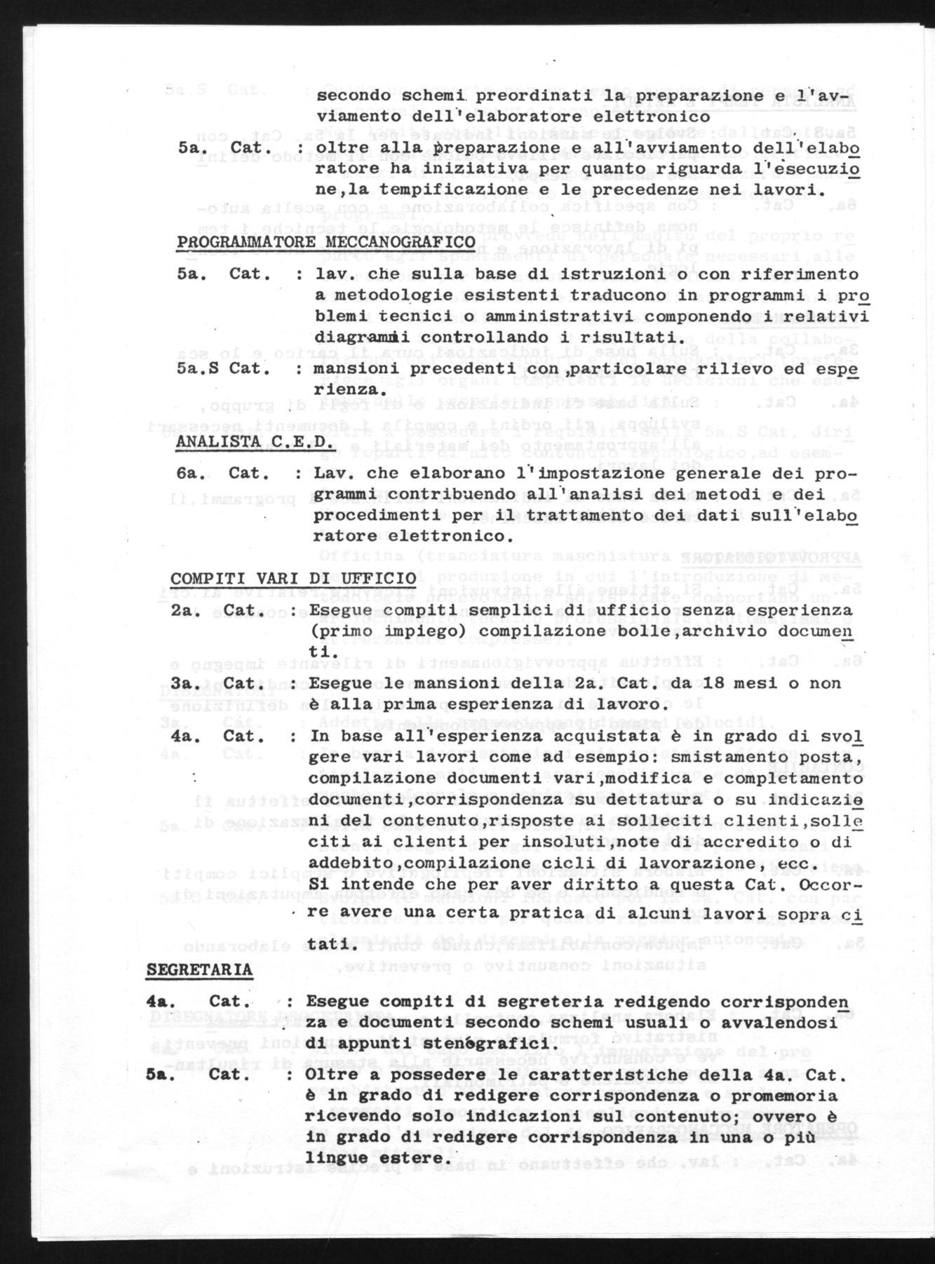 5a. Cat. : Oltre a possedere le caratteristiche della 4a. Cat. è in grado di redigere corrispondenza o promemoria ricevendo solo indicazioni sul contenuto; ovvero è in grado di redigere corrispondenza in una o più lingue estere.