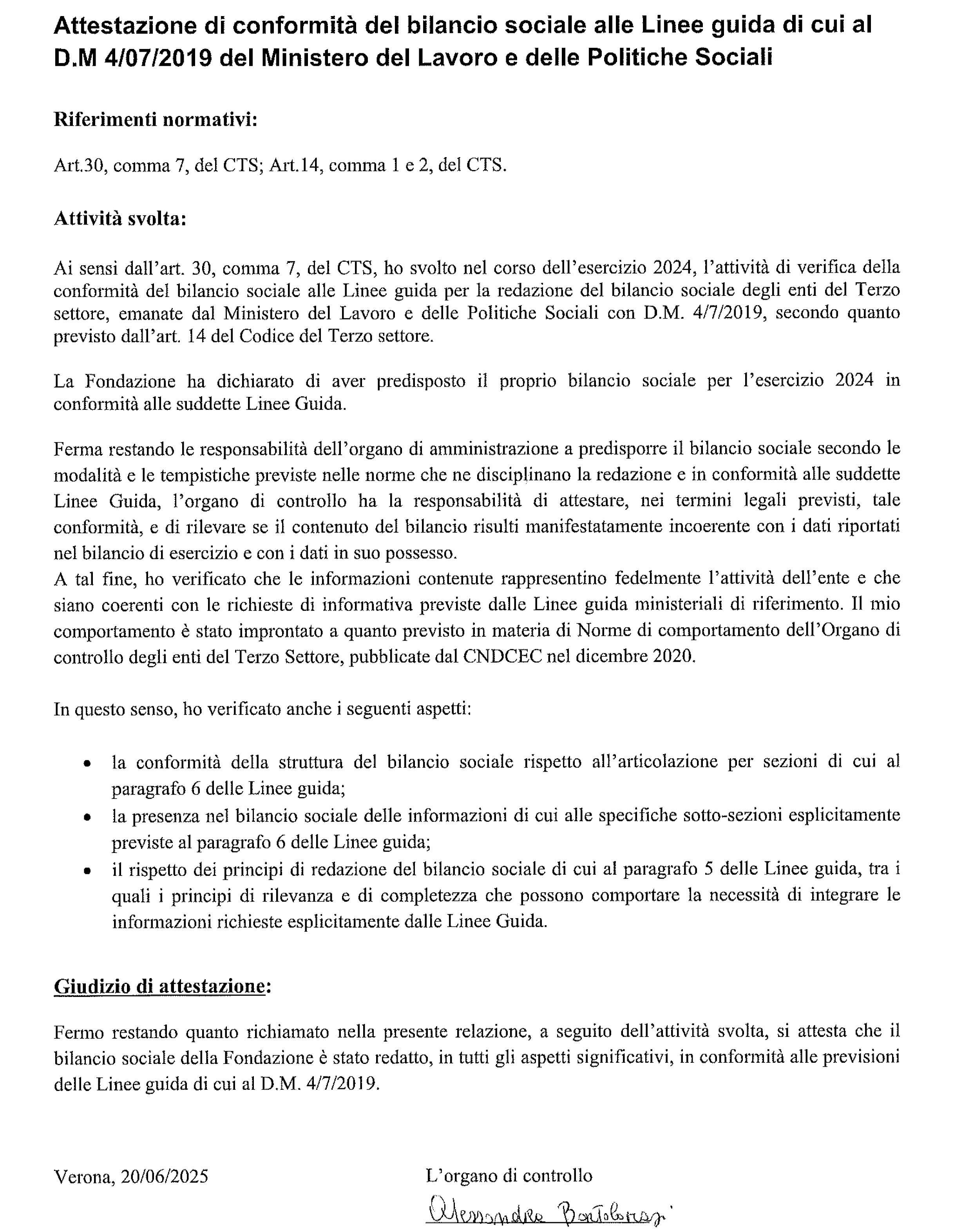 La redazione del Bilancio sociale si è attenuta alle Linee guida del ministero del Lavoro e delle Politiche sociali emanate con il decreto del 4 luglio 2019 per gli Enti del Terzo Settore. Il documento risponde così all’obiettivo di fornire una rappresentazione strutturata e puntuale delle responsabilità, dei comportamenti e dei risultati sociali, ambientali ed economici prodotti dalle attività della Fondazione, allargando il perimetro dell’informazione essenzialmente economica offerta dal Bilancio d’esercizio.
