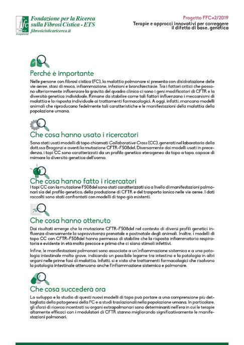 In questa prospettiva, e nel contesto positivo di crescente disponibilità di farmaci modulatori per molti malati, FFC Ricerca ha messo a punto nuove linee strategiche, focalizzate al raggiungimento della miglior cura possibile per tutte le persone con fibrosi cistica, sia per quelle che già assumono i nuovi composti ma non sono guarite dalla malattia, sia per chi non risponde ai trattamenti attualmente disponibili, sia per coloro che non hanno ancora a disposizione soluzioni terapeutiche specifiche.