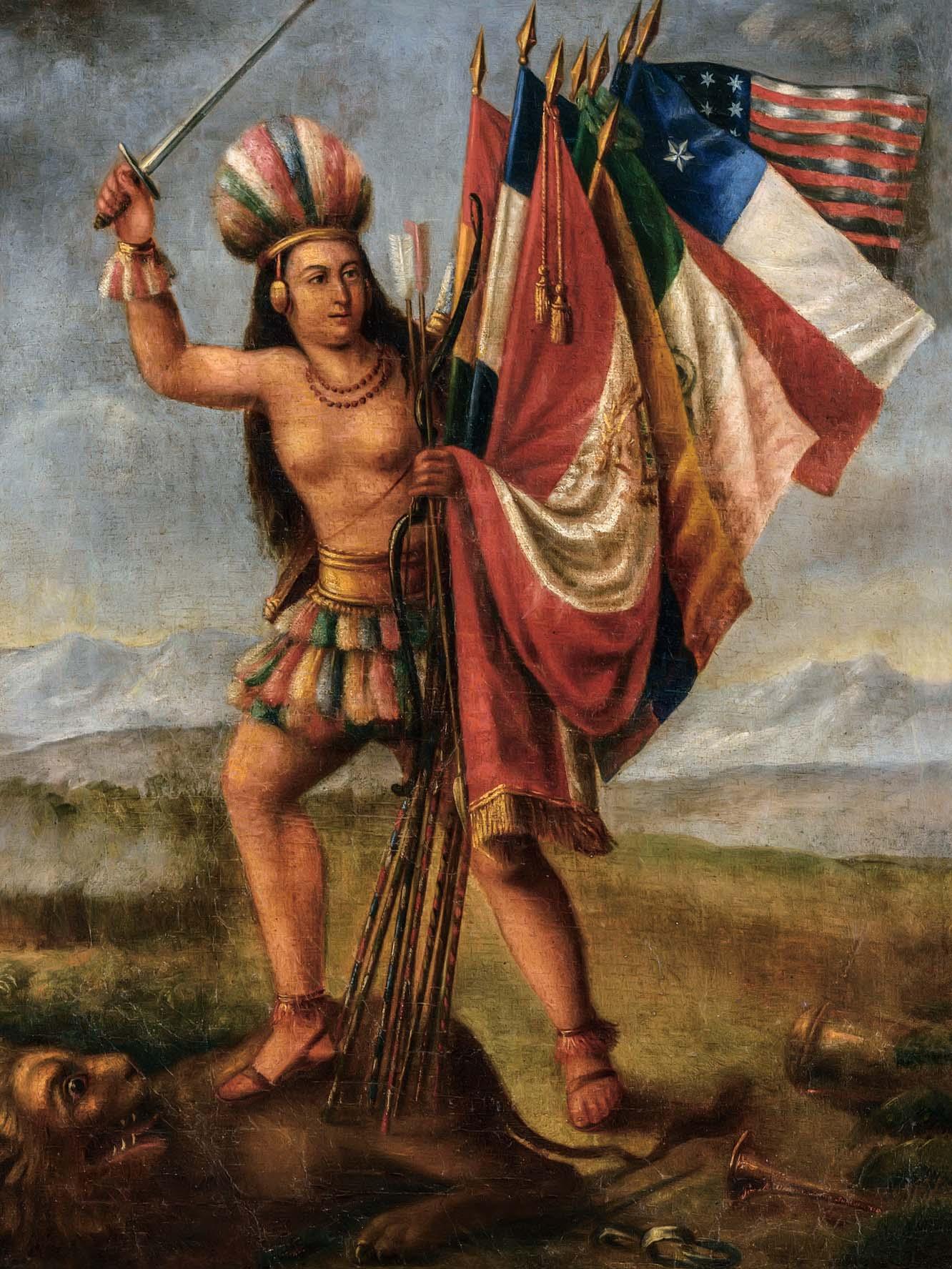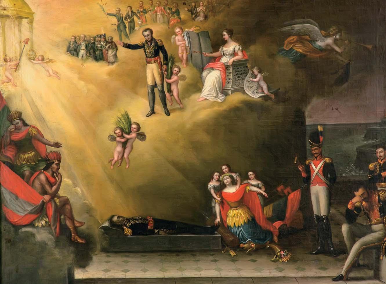 Anónimo surandino. Simón Bolívar con representaciones alegóricas del Perú y la Gran Colombia, circa 1825. Museo Nacional de Arqueología, Antropología e Historia del Perú, Lima.
