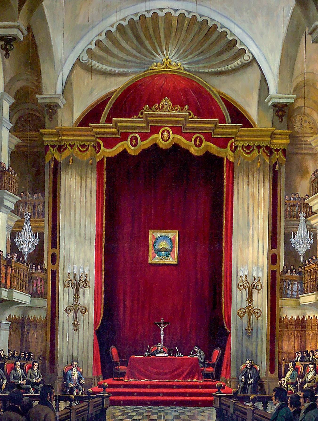 Pintura del Primer Congreso Constituyente del Perú en San Marcos, que tuvo lugar en la Iglesia de la Caridad (hoy desaparecida), circa 1822. Congreso de la República del Perú.