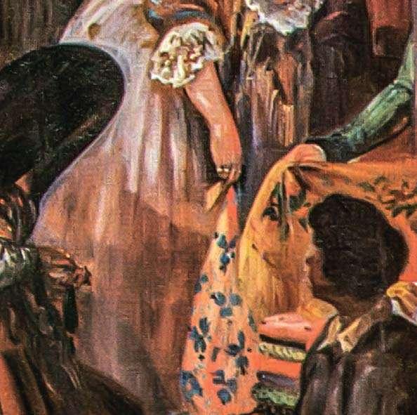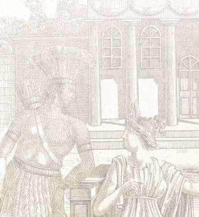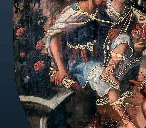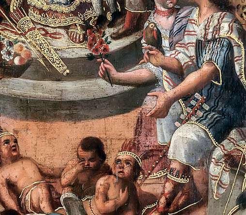 Fig. 3. Jean Andreas Biset, siglo XVII. América trae su riqueza a Europa. Una mujer joven de tez pálida, recibe indios de América que le traen comida exótica. La Rochelle, Musée du Nouveau monde.