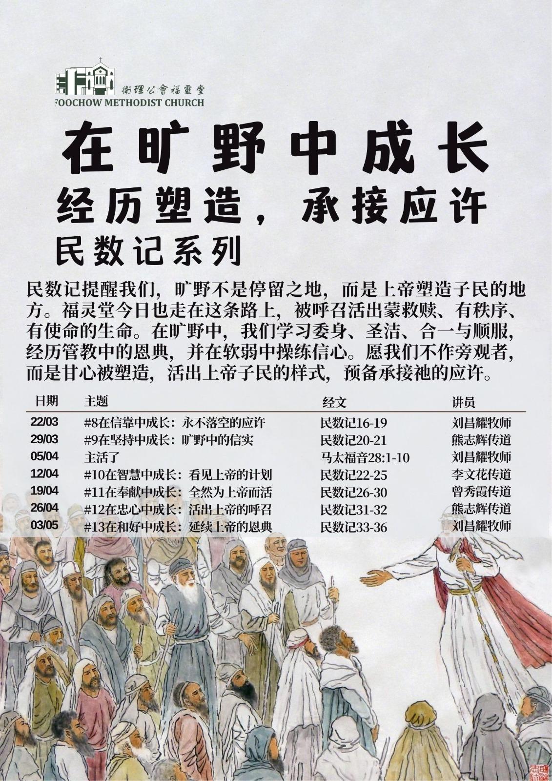 因此,在接下来的三个月,我诚挚邀请全教会一同走进《民数记》, 借着每日《陪你一起吃灵粮》以及每周的主日信息,让上帝的话语 塑造我们的生命。《民数记》提醒我们:旷野并不是徒然的等待, 而是上帝塑造祂子民的地方。在旷野中,上帝教导祂的百姓学习顺 服、信靠、圣洁与忍耐,好使他们能承受祂的应许,成为他人的祝 福。