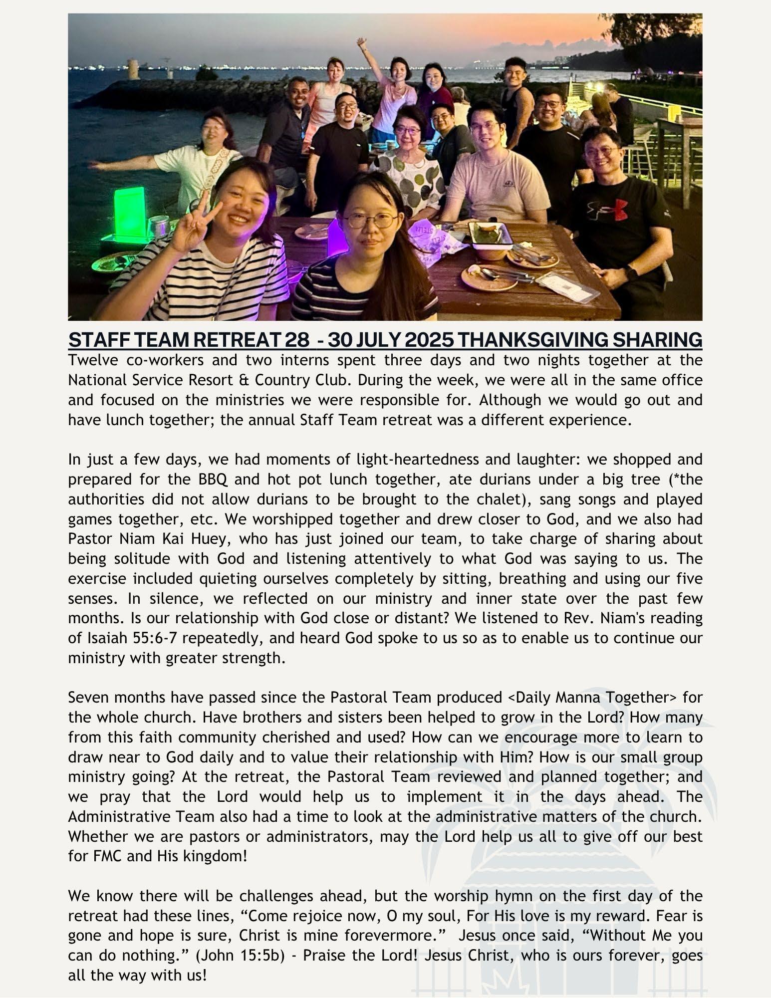 Rev. Dr. Niam Kai Huey who serves as a part-time pastor at FMC, has also been appointed as the director of the Methodist Disciple Agency, as well as a guest lecturer at TTC.