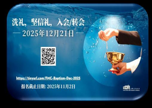 凡是愿意于12月21日洗礼(成人或幼儿洗)、 入会/转会、坚信礼(16岁或以上)的弟兄姐妹, 请向教牧同工、办公室同工索取表格报名; 亦可点击以下报名链接或扫描二维码上网报名。 https://tinyurl.com/FMC-Baptism-Dec-2025 报名截止日期:11月21日
