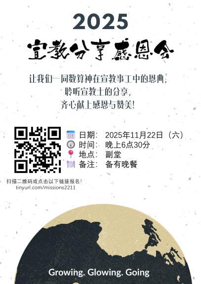 欢迎弟兄姐妹踊跃出席, 与堂会宣教士们一起为 2025年献上感恩。