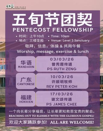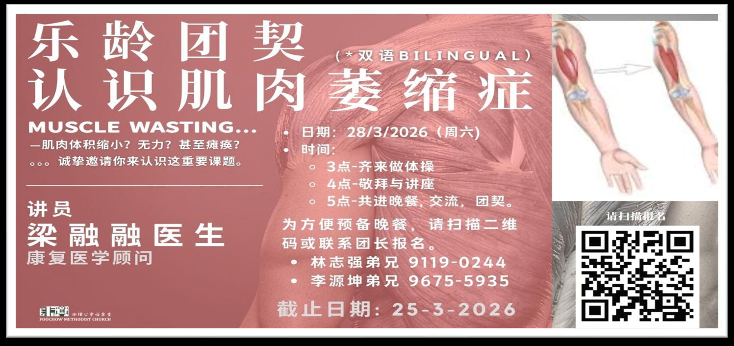 时间:上午10时(敬拜、信息、体操 & 共用午餐) 地点:三楼圣殿
