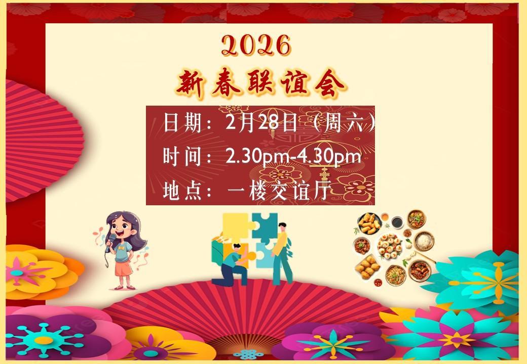 恰逢农历新年及教会新春联谊聚会,乐龄团契二 月份将暂停聚会。下次聚会定于 3 月 14 日 举行, 敬请弟兄姐妹留意并踊跃参与。
