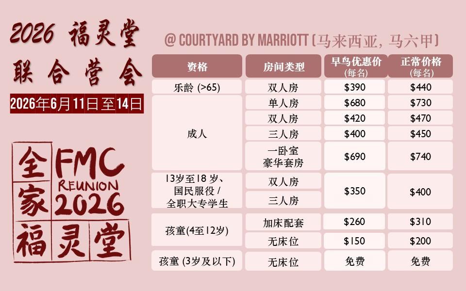 让我们一同预备心,迎接这个充满意义的团聚 时刻!这是一个难得的机会,福灵堂大家庭将 跨世代、跨语音、齐聚一堂,一起聆听神的话 语、彼此交通并建立更深的关系。