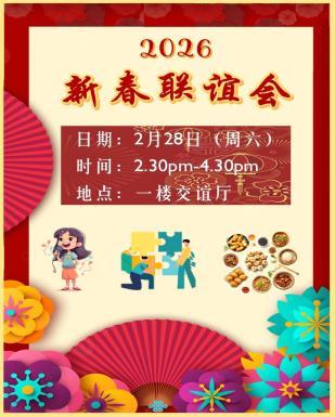 恰逢农历新年及教会新春联谊聚会,乐龄团契二月份 将暂停聚会。下次聚会定于 3 月 14 日 举行,敬请弟 兄姐妹留意并踊跃参与。