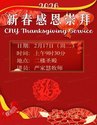 新春伊始,让我们怀着感恩的心,齐聚主的圣殿, 数算过去一年的恩典,将新的一年交托在主手中, 同心献上祝福。愿我们以感恩敬拜,领受上帝为新 年所预备的丰盛恩典。