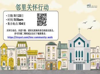 已报名参与的弟兄姐妹,请于上午11时15分在 104室集合。借这服事,建立和维系福灵堂与我们 邻里社区的关系,并邀请他们来参加我们教会的活动。