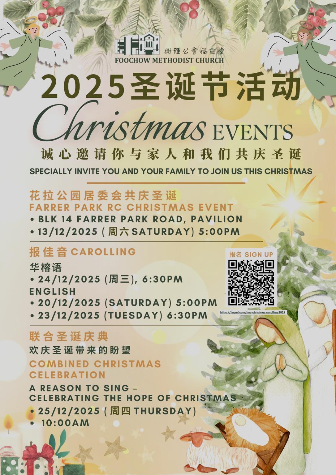 若弟兄姐妹有意开放住家,让佳音队于12月24日 (周三)傍晚前往府上,与您及亲友一同分享 圣诞节的意义,请联络郑淑玲姐妹9829 8000或 余其顺弟兄9641 9489。