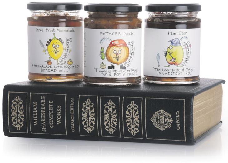 OuseValley proudly presents, ‘Spread the Word’, a deliciously witty trio pairing the delights of food and literature. The jars feature fruity Shakespearean illustrations by the renowned illustrator and cartoonist Ann Edwards and a light-hearted synopsis of the play in question.