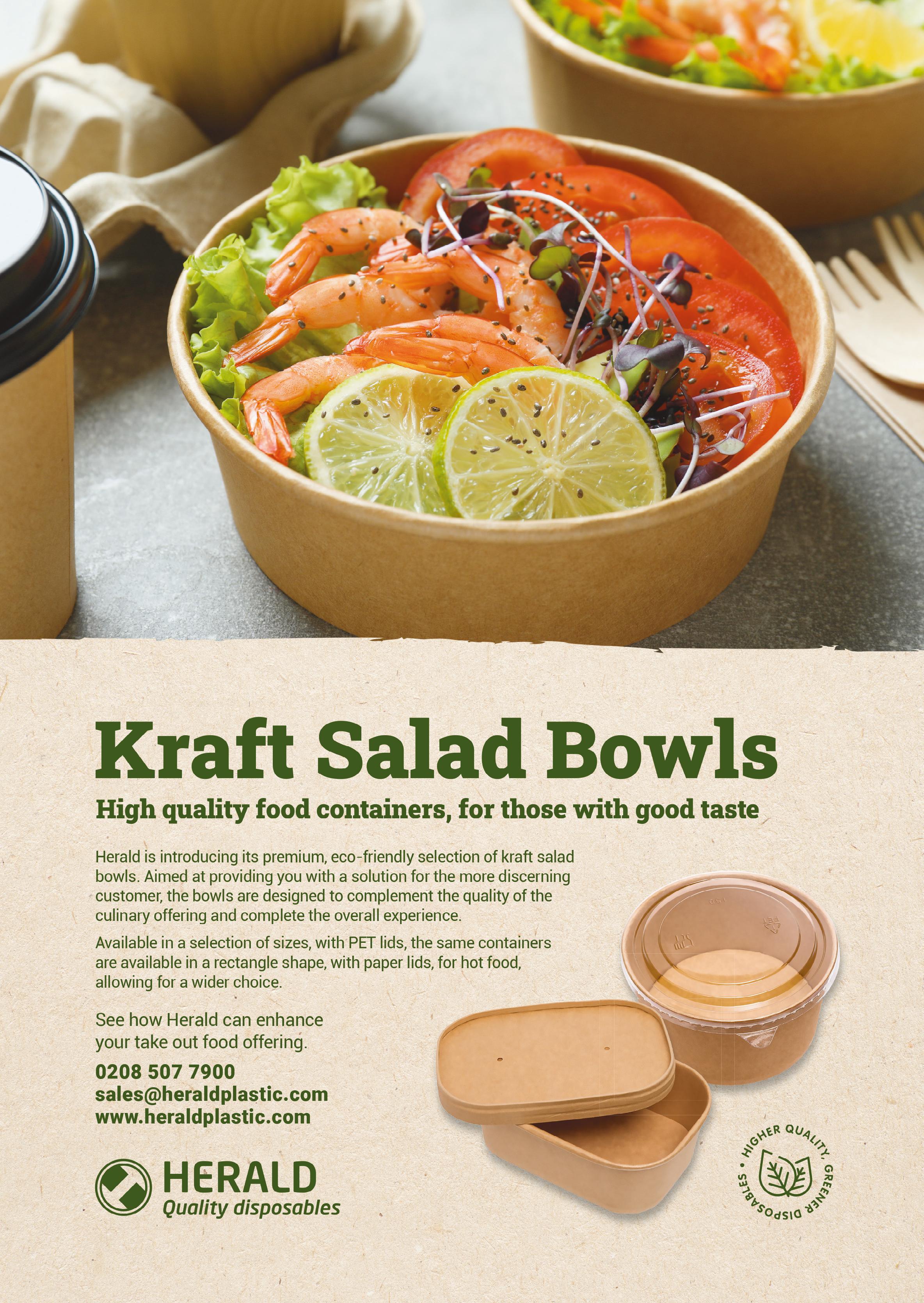Sitting alongside Herald’s kraft salad bowls, which are available in a selection of sizes, including 500cc, 750cc and 1,000cc, and come with PET lids, the hot food containers have paper lids and are designed to enhance the product offering, presenting the contents in the most optimum light.
