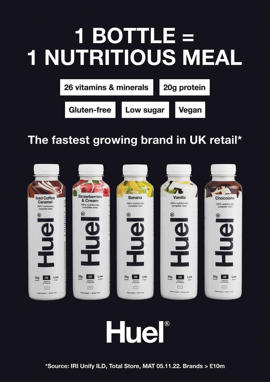 flavours such as Chocolate, Vanilla, Banana, and Iced Coffee Caramel. The products are best merchandised cold alongside other food-to-go options. The data shows that the most popular missions for Huel are breakfast and lunch. www.uk.huel.com
