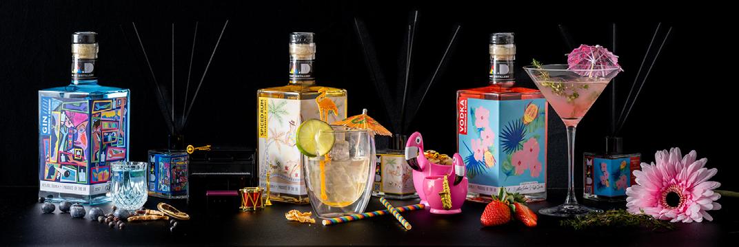 citrus-driven London dry based gin with 10 botanicals, a molasses-based rum sourced from the Caribbean, and a four times distilled British wheat-based vodka, with natural water drawn from the Bannau Brycheiniog region.