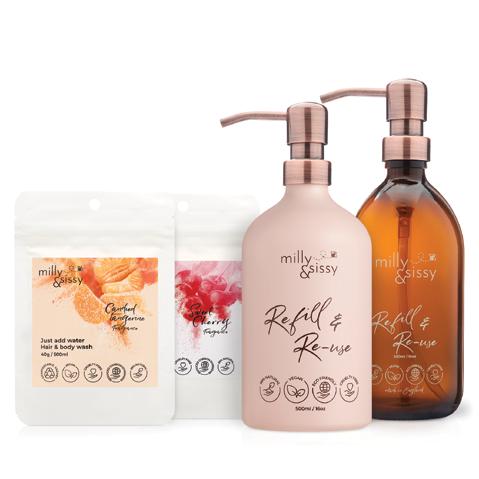 milly&sissy products include hair and body wash sets, face wash sets, hand wash sets, reusable pump & bottles, shower cremes, deodorants, cleansing pads, and travel sets. Shake up your beauty regime and enter