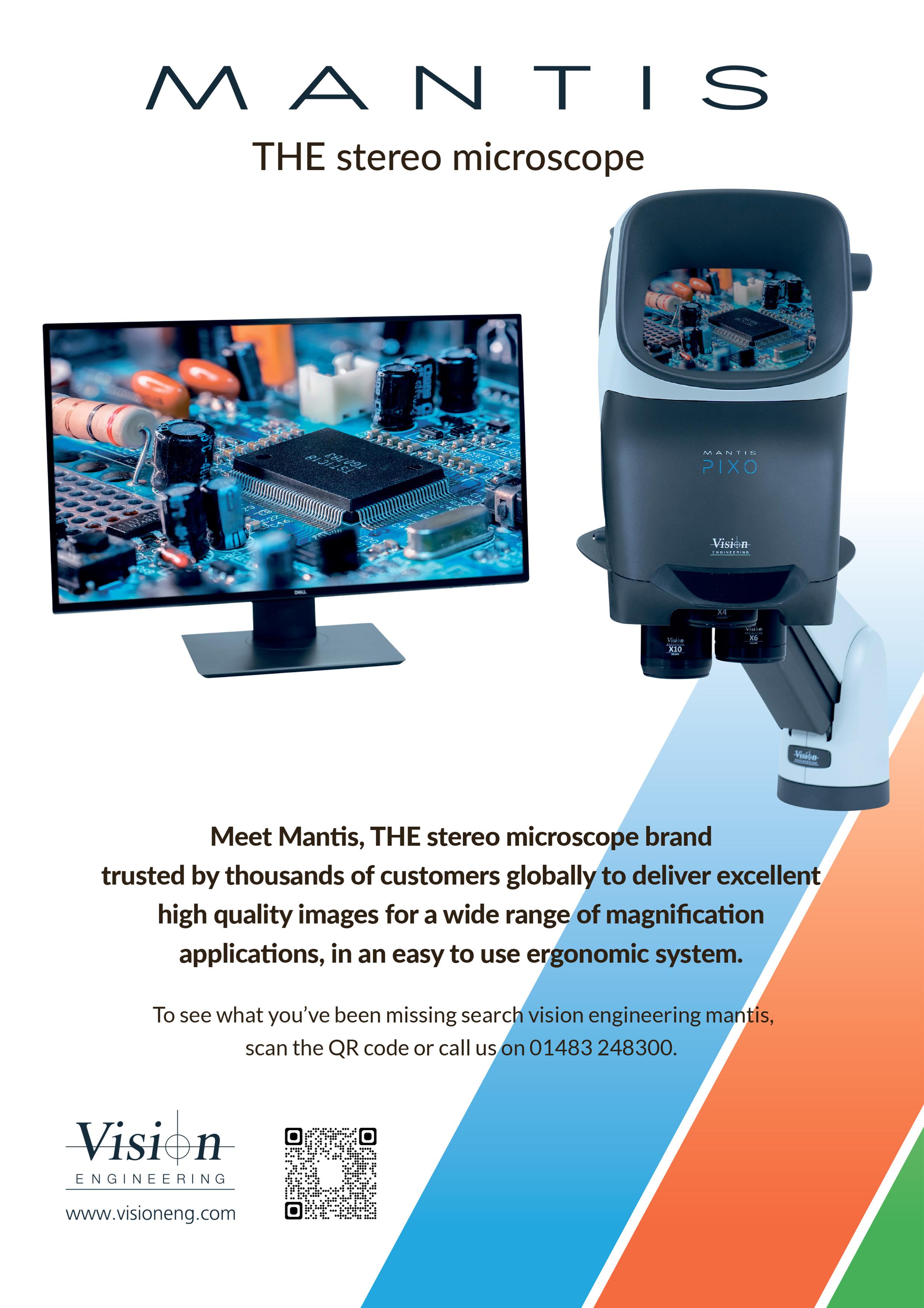 Vision Engineering, the world-leading provider of innovative inspection, metrology and digital 3D visualisation solutions, has launched Mantis 3rd Gen, the latest addition to its best-selling and awardwinning range of ergonomic optical stereo microscopes. Mantis 3rd Gen is available to demo at the Advanced Engineering Show, on 1 and 2 November 2023 at stand N180.