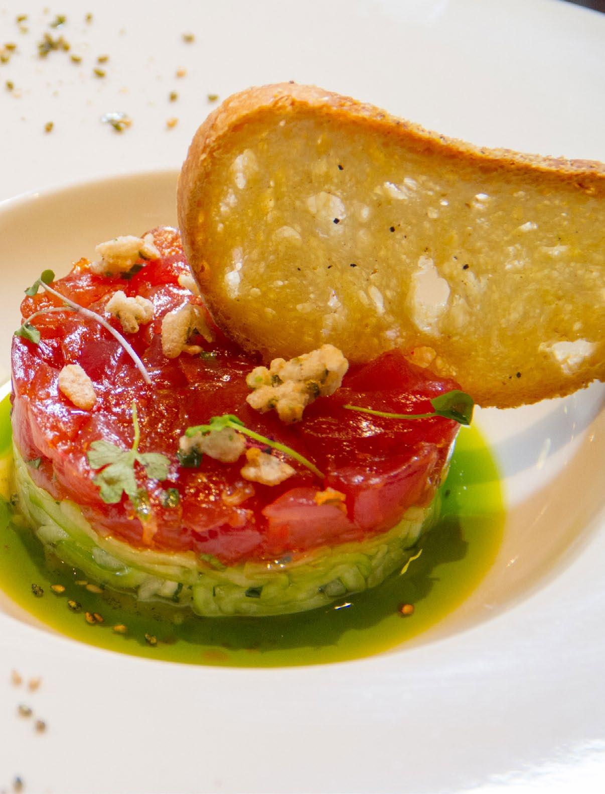 Roll cucumber pieces in a bowl of kosher salt and let soak for 5 minutes. Rinse. Place cucumber in another bowl and pour rice wine vinegar over the top. Refrigerate for approx. 1 hour. Slice tuna into small square pieces. Place tuna in a medium mixing bowl. Add cucumber, pine nuts, sesame seeds and ginger vinaigrette into the bowl of tuna. Gently mix together. Press each portion of mixture into a 3” ring mold to shape.