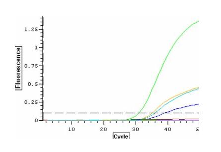 2. Optisk detektionssystem — ved hjælp af de fluorescerende prober (lygtepæle), måles mængden af DNA for hver temperaturcyklus (deraf navnet real-time). Mængden af lys er proportional med mængden af DNA.