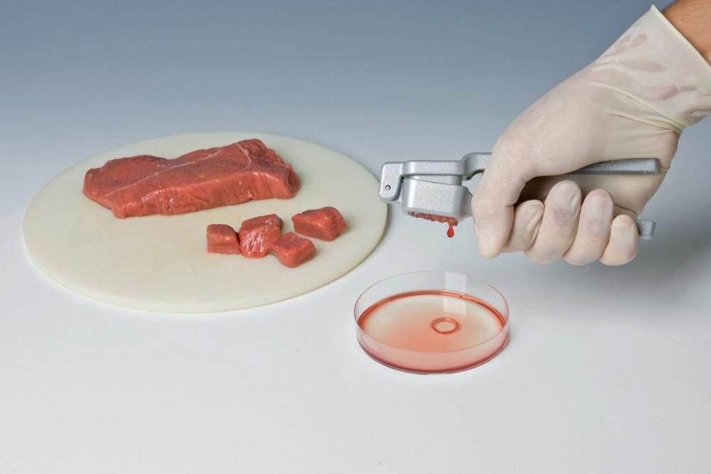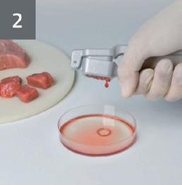 Skær kødet i stykker på ca. 2 cm3 og kom det ene stykke ned i kødpressen. Øg trykket langsomt og hold konstant indtil ca. 200 µL kødsaft opnås.