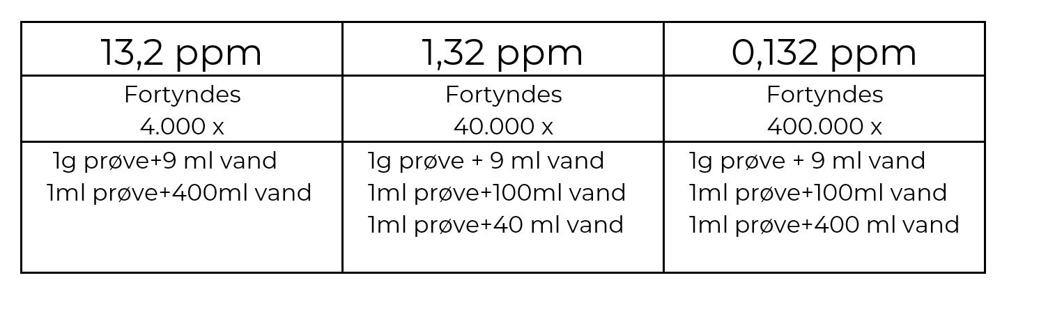 • Der kan tydeligt skelnes mellem en prøve der er lige over detektionsniveauet (1,32 ppm) og en prøve som er lige under detektionsniveauet (0,132 ppm)