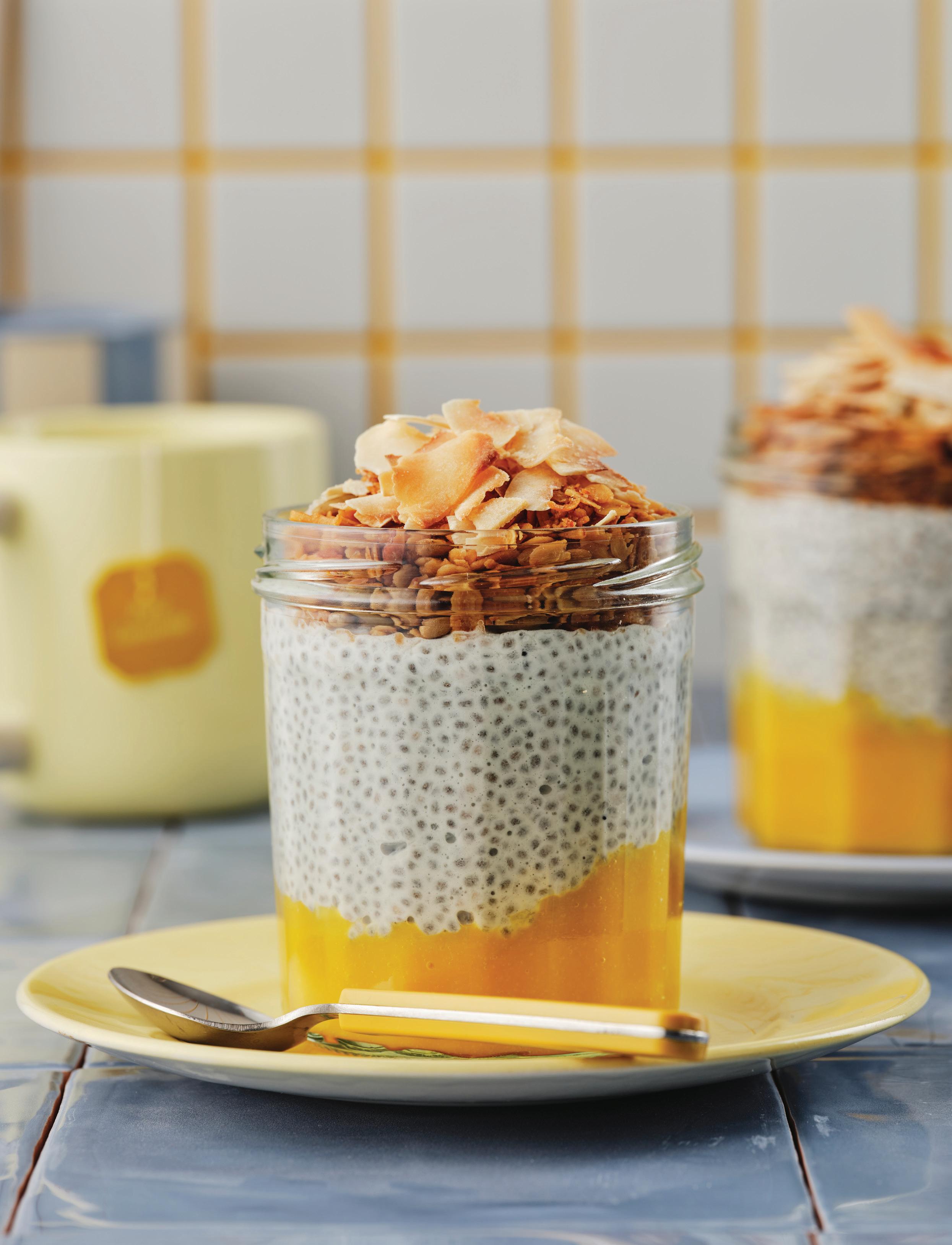 4. To serve, pour about 3 tablespoons of mango puree into the base of a glass or jar and spoon over the chia pudding.