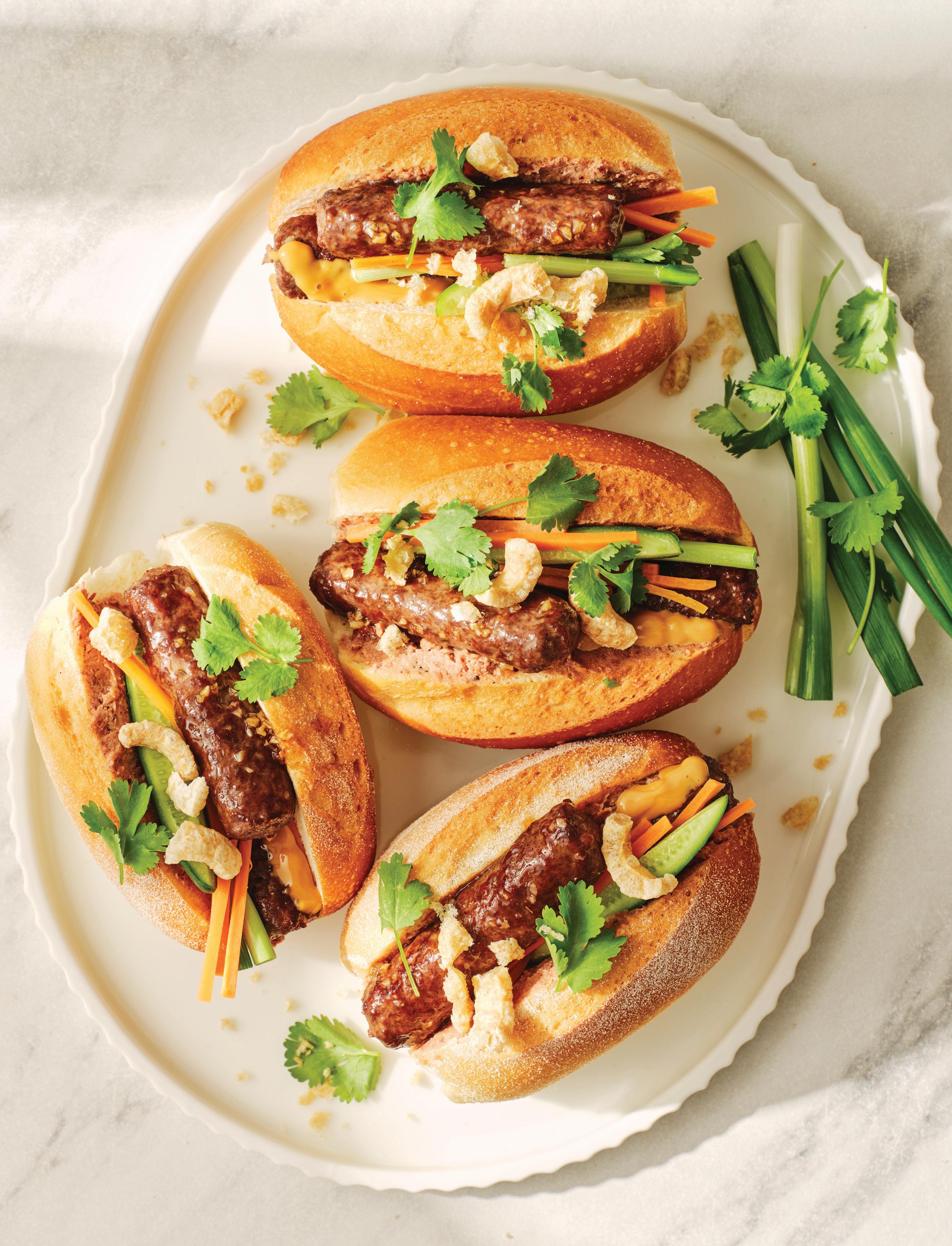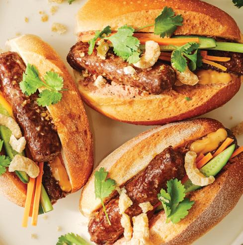 5. Halve the rolls, spread with pate, add one chevapchichi, top with drained carrot and cucumber, and drizzle with mayonnaise. Add a second chevapchichi and garnish with coriander and pork crackling.