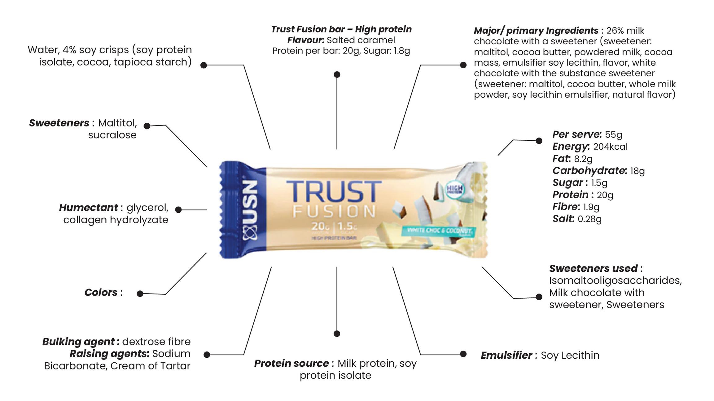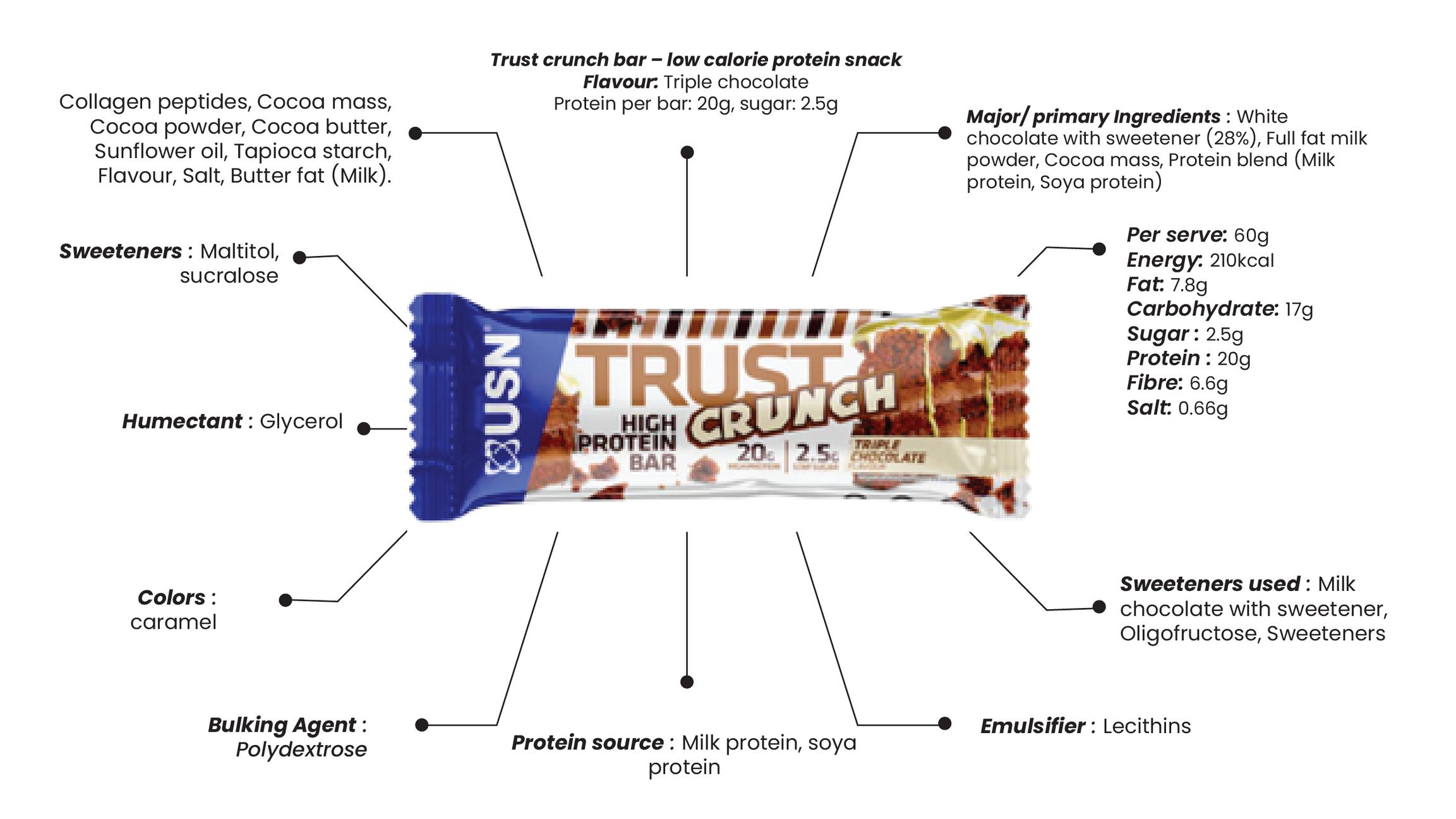 Brand Observed Founded in 2000 by Albé Geldenhuys and has been at the forefront of sports nutrition research with a mission to create an effective sports nutrition supplements - as used by professional and non-professional athletes and thefirst ingredient, such as milk protein, soy protein or chocolate flavoured and empowder our community to make better Sports performance, weight control and muscle-building supplementation Company overview: Target Product Category : Trust protein bars Name of the Product : Trust crunch bars, Trust cookie bars, Trust fushion bars. 05