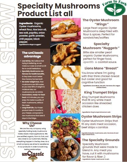 We want more people to experience more mushrooms—not just as a diced side or rare delicacy in fettuccine, unClassic wants to make mushrooms a center of the plate, main course. Our specialty mushroom nuggets, steak tips, strips… are a fusion of culinary innovation and proactivity, as we want to shed new light to how easy it can be to cook with mushrooms.The founder, LuizaVillela, started her career in food science and innovation, but there is no better food scientist than nature.We take pride in crafting whole, not processed organic mushrooms that makes people rethink the role of mushrooms in their diets.