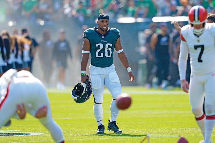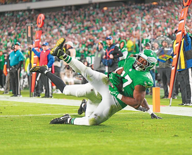 Players and fans are still buzzing over Barkley’s now legendary 14-yard run against Jacksonville when at the start of the second quarter, he took a short pass from Hurts, then put a wicked spin move on Jaguars linebacker Devin Lloyd, then turned up field to pull o a Dr. J-like backward, no-look hurdle over Jacksonville cornerback Jarrian Jones before he was finally tackled.