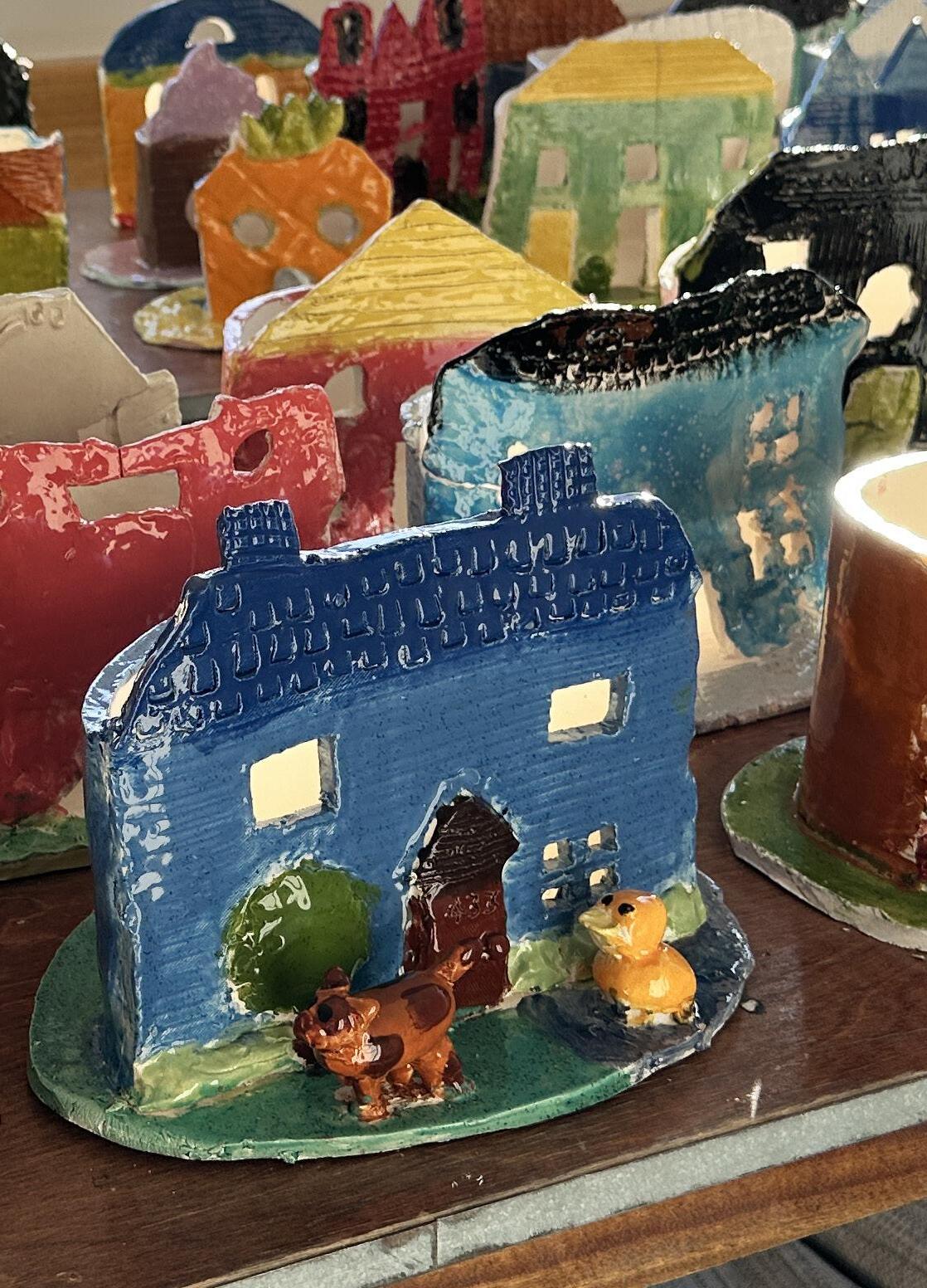 “Students need to think like architects and designers, balancing aesthetic considerations with structural stability,” he explained. “Each piece is composed of three clay slabs that are carefully balanced and attached. Student artists focus on three dimensional details, texture, and the interplay of positive and negative space to create visually pleasing clay buildings.”