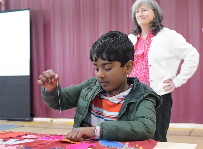 On April 8, the Foote School Visual and Performing Arts departments co-hosted our second annual Arts Night. This year's theme, “Stitched Together,” captured the spirit of this community sewing bee, led by current Foote parent and artist Megan Craig. Leading up to the event, students, faculty, staff, alumni, former faculty and other community members dropped by the Twichell Room to cut felt shapes in preparation for Arts Night, when we gathered to stitch the felt shapes onto a banner that will be displayed in the school. The idea for this project came from a 2018 NEA public art project in which Megan participated, called “Memory Edit: I Will Never Forget” in 2018.