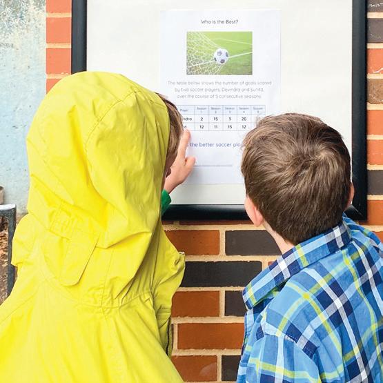 Unlike the Story Walk, the Math Walk features panels that are unrelated—in other words, you can start at any spot you want. Half of the panels feature problems with an actual answer, like, “How many triangles are in this picture?” Others are open-ended, designed to inspire conversation about possible solutions. For example, “Who do you think is the best soccer player in the world and why?” To answer this question, students can draw from statistical data, uniform numbers or any other criteria they choose to make their point and engage in a healthy debate.