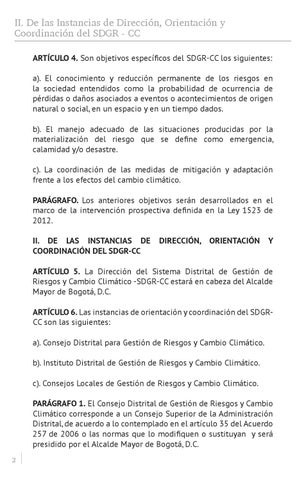 ARTÍCULO 5. La Dirección del Sistema Distrital de Gestión de Riesgos y Cambio Climático -SDGR-CC estará en cabeza del Alcalde Mayor de Bogotá, D.C. ARTÍCULO 6. Las instancias de orientación y coordinación del SDGRCC son las siguientes: a). Consejo Distrital para Gestión de Riesgos y Cambio Climático. b). Instituto Distrital de Gestión de Riesgos y Cambio Climático. c). Consejos Locales de Gestión de Riesgos y Cambio Climático. PARÁGRAFO 1. El Consejo Distrital de Gestión de Riesgos y Cambio Climático corresponde a un Consejo Superior de la Administración Distrital, de acuerdo a lo contemplado en el artículo 35 del Acuerdo 257 de 2006 o las normas que lo modifiquen o sustituyan y será presidido por el Alcalde Mayor de Bogotá, D.C. 2