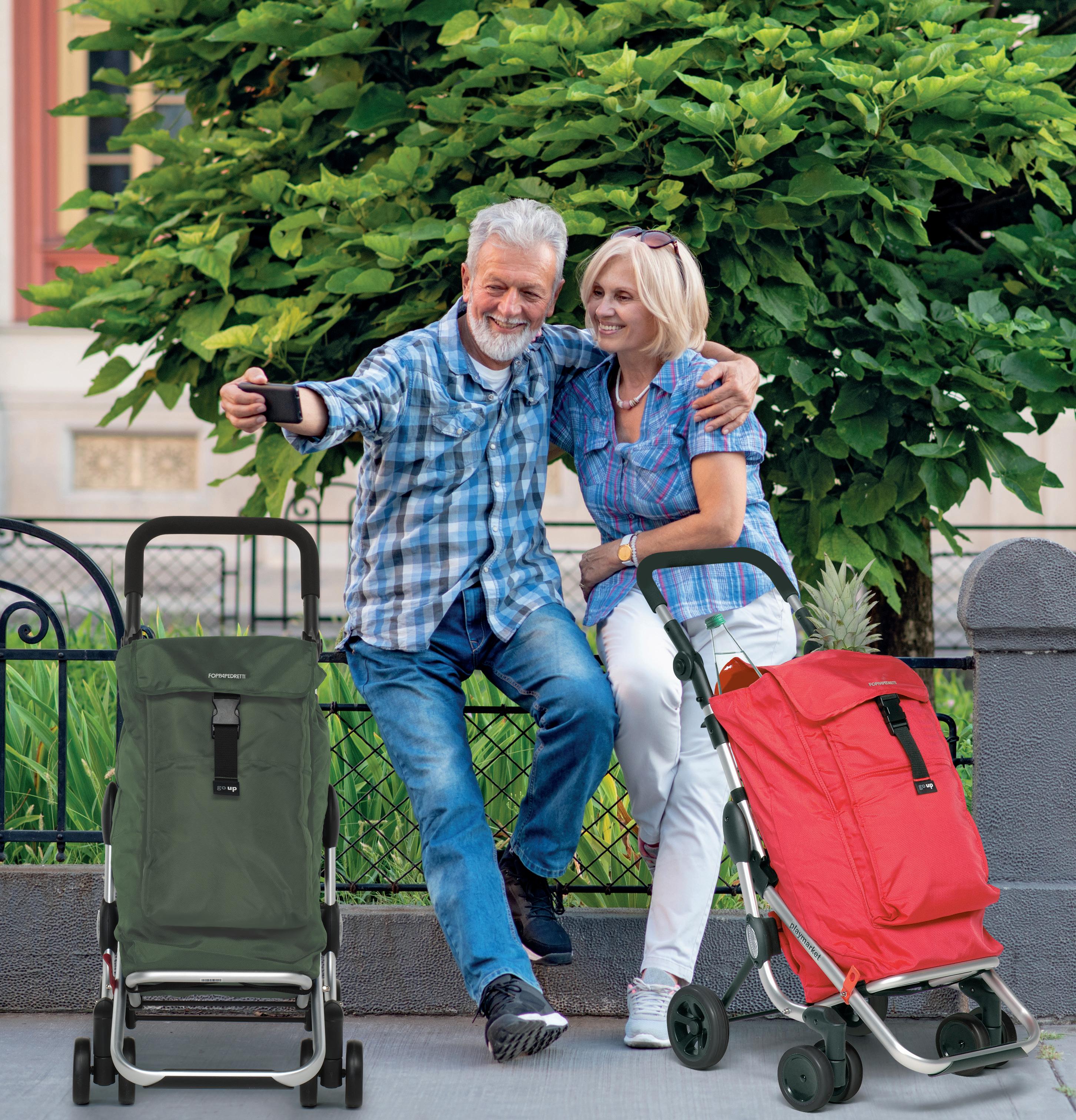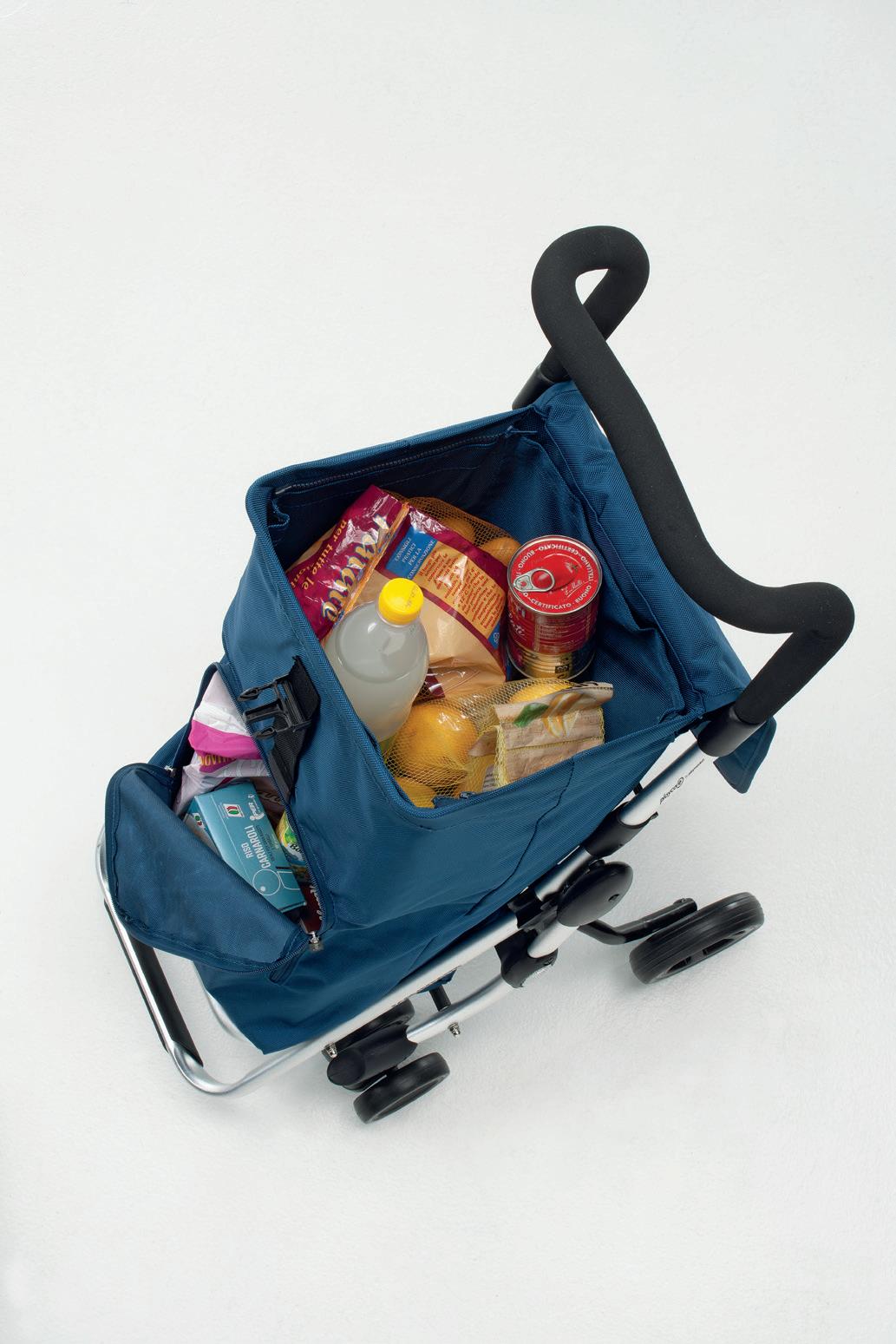 Carrello spesa leggero e facilmente chiudibile. Dotato di capiente borsa con scomparto inferiore accessibile tramite zip e scomparto superiore amovibile. maniglione che offre un appoggio sicuro e stabile, ha un rivestimento antiscivolo ed è regolabile in altezza. Le ruote posteriori si possono richiudere all’interno per facilitare il traino su marciapiedi e gradini.