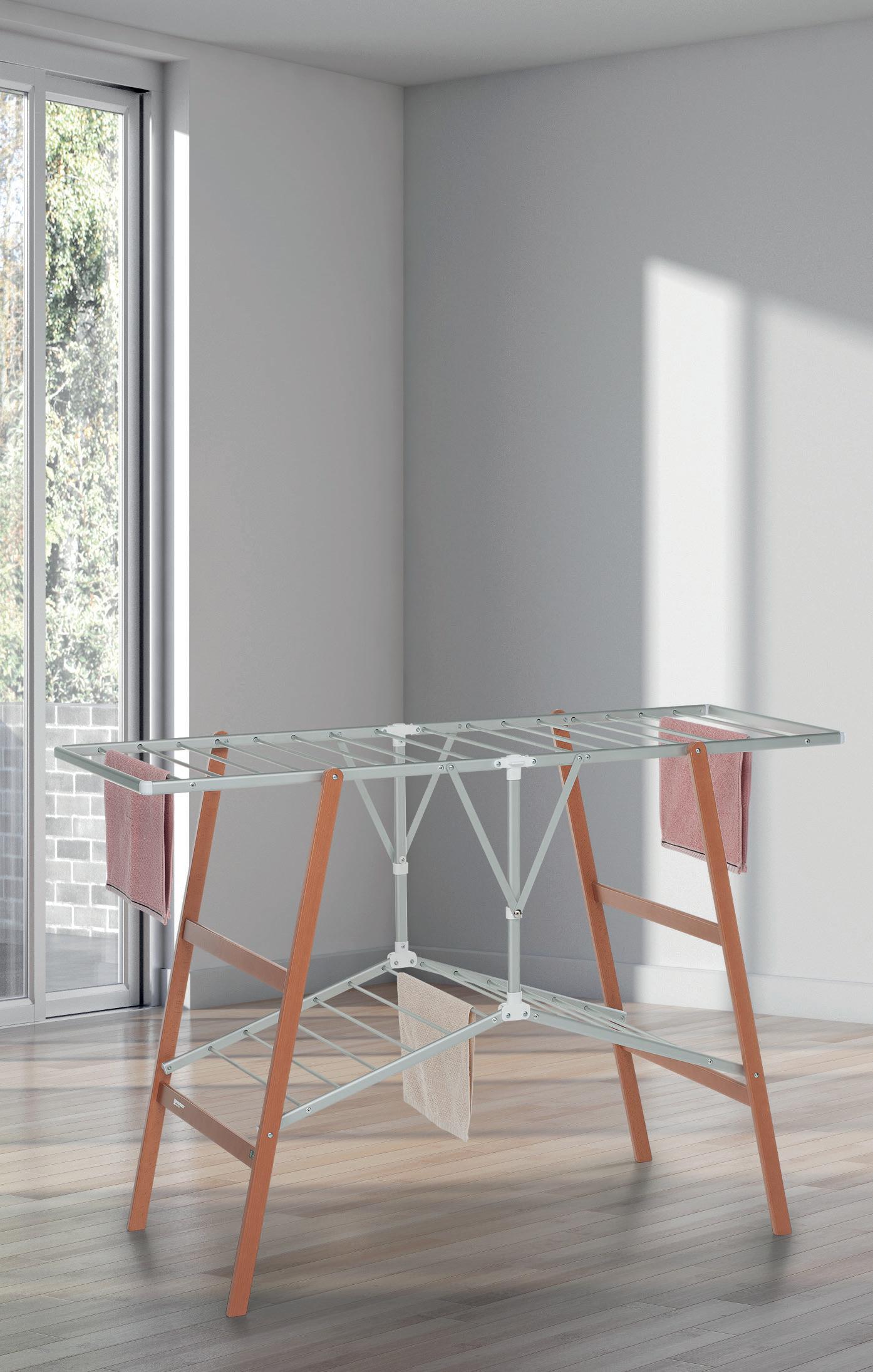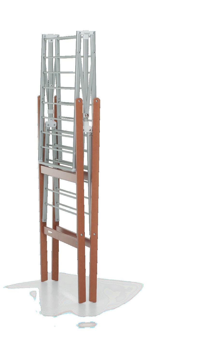 Stendibiancheria con sistema di apertura a pantografo, estensibile a 2 altezze, completamente chiudibile, struttura in legno