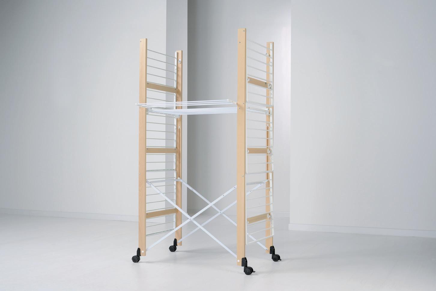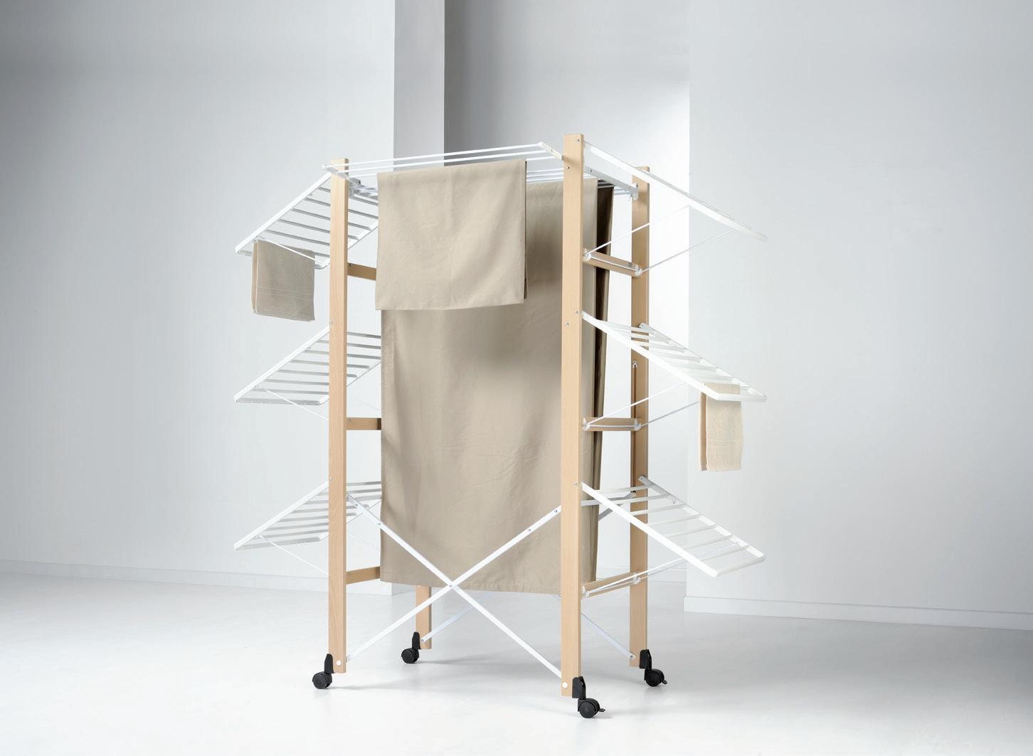 Folding drying rack. It offers 14 linear meters of drying space for laundry. Structure in solid beech wood and white varnished aluminium or anodized aluminium.