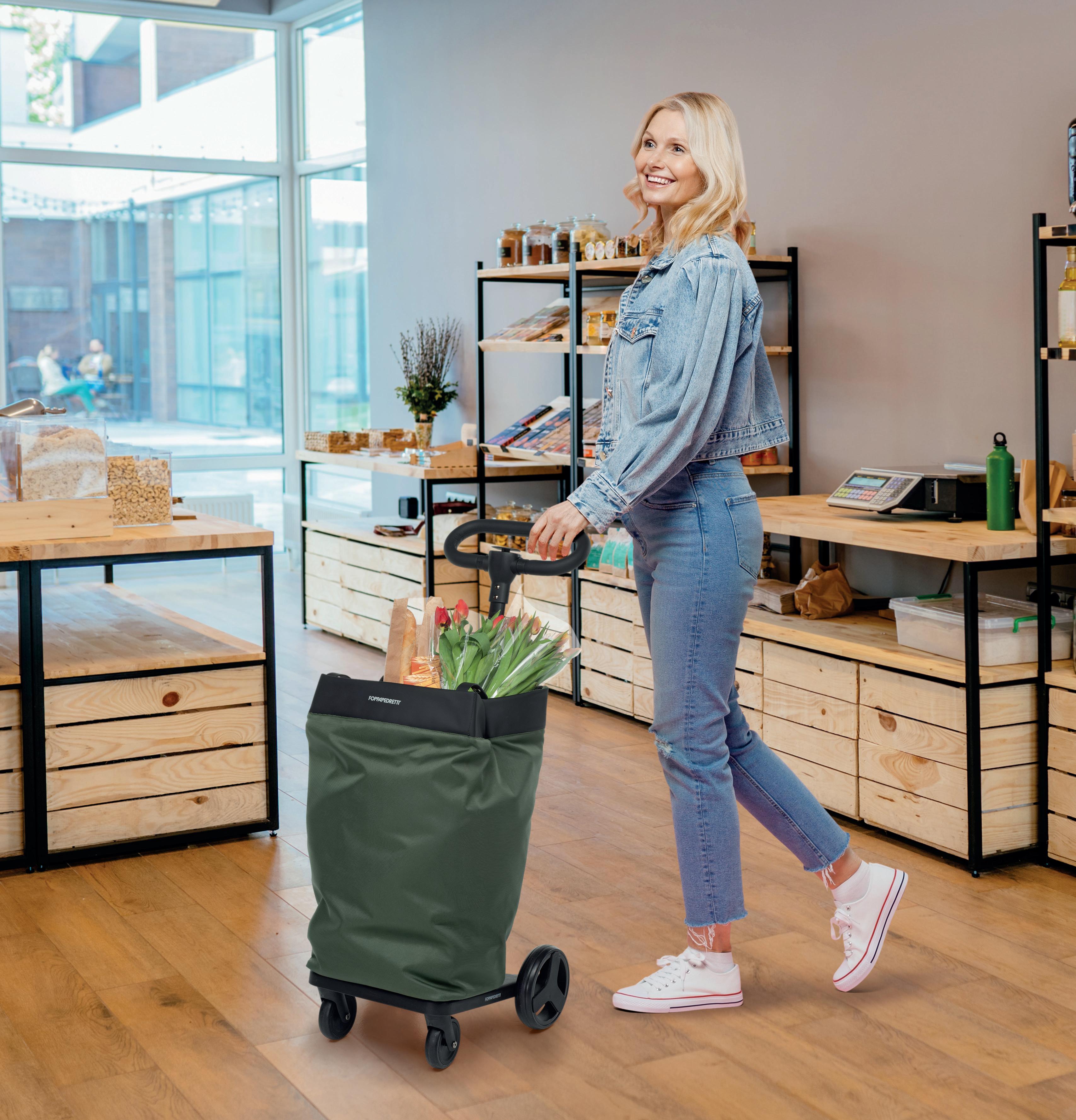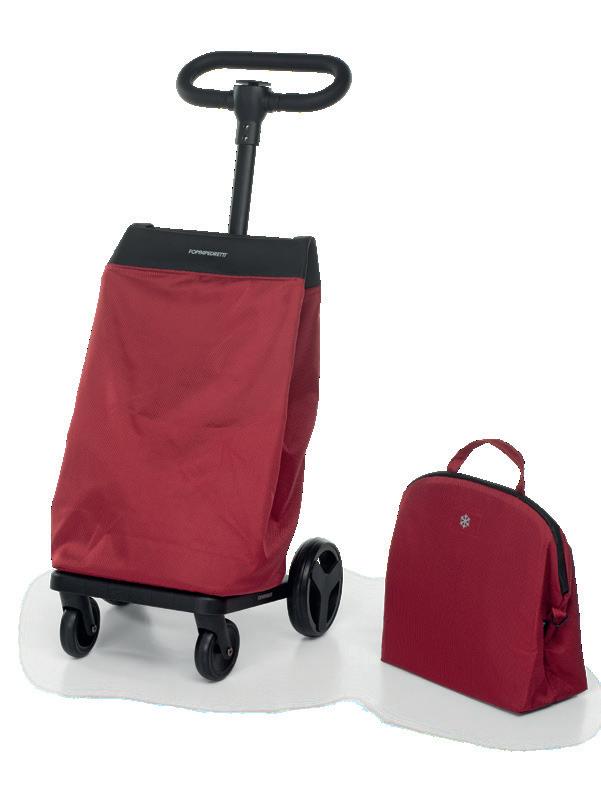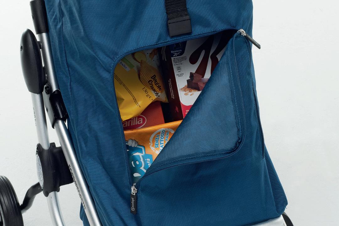 Carrello porta spesa lavabile che si traina facilmente anche in presenza di scalini. Borsa principale con capienza 38 litri e tasca termica con capienza 6 litri. Maniglione regolabile in gomma antiscivolo, catarifrangenti laterali, telaio