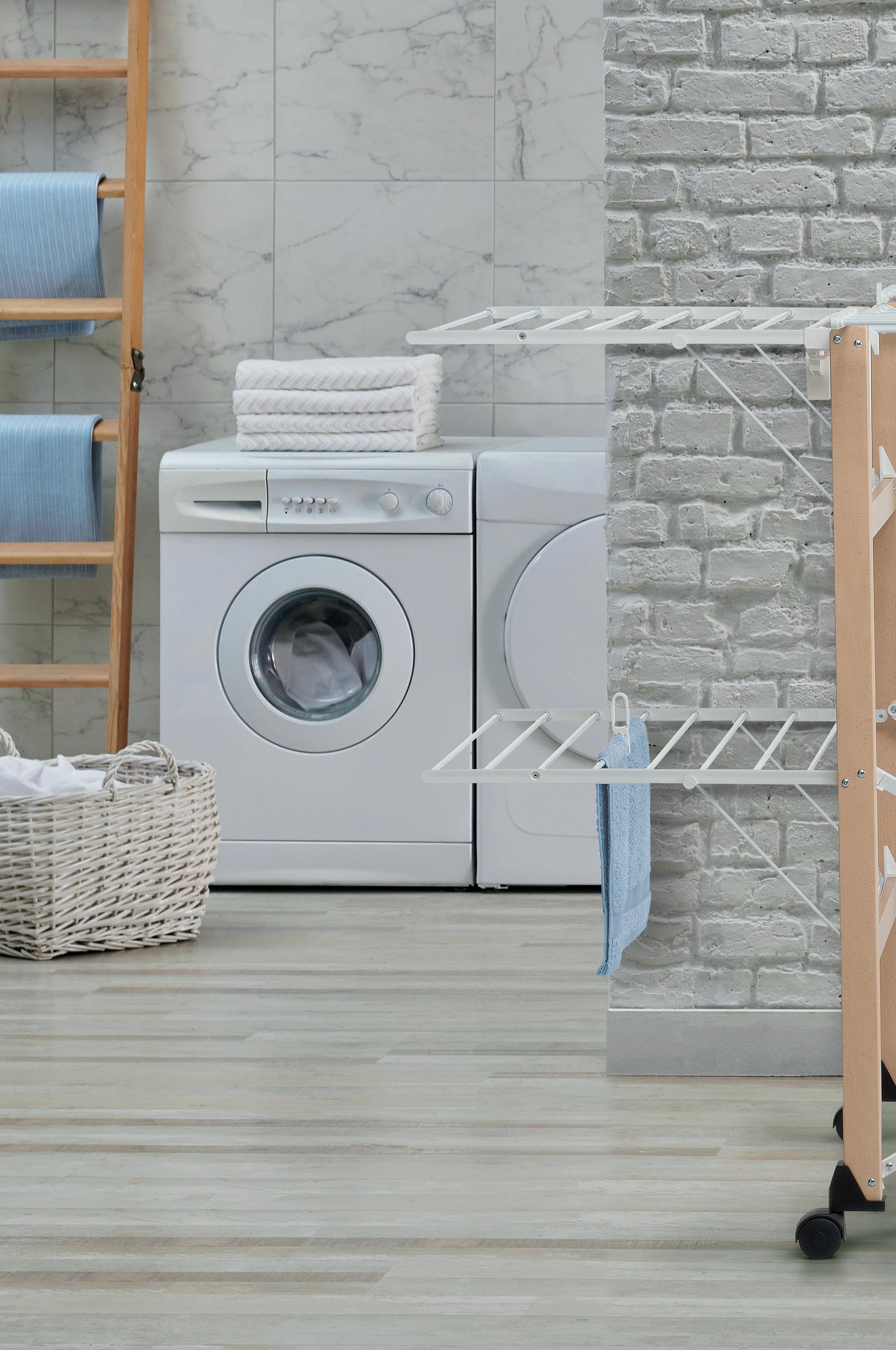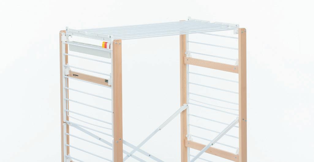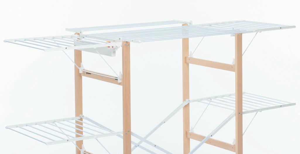 Extensible clotheshorse with solid wood structure and independent side racks that open even separately. It has 30 meters of drying line space to hang sheets and bulky laundry. It folds up completely to just 19 cm thick when not in use. Features 6
