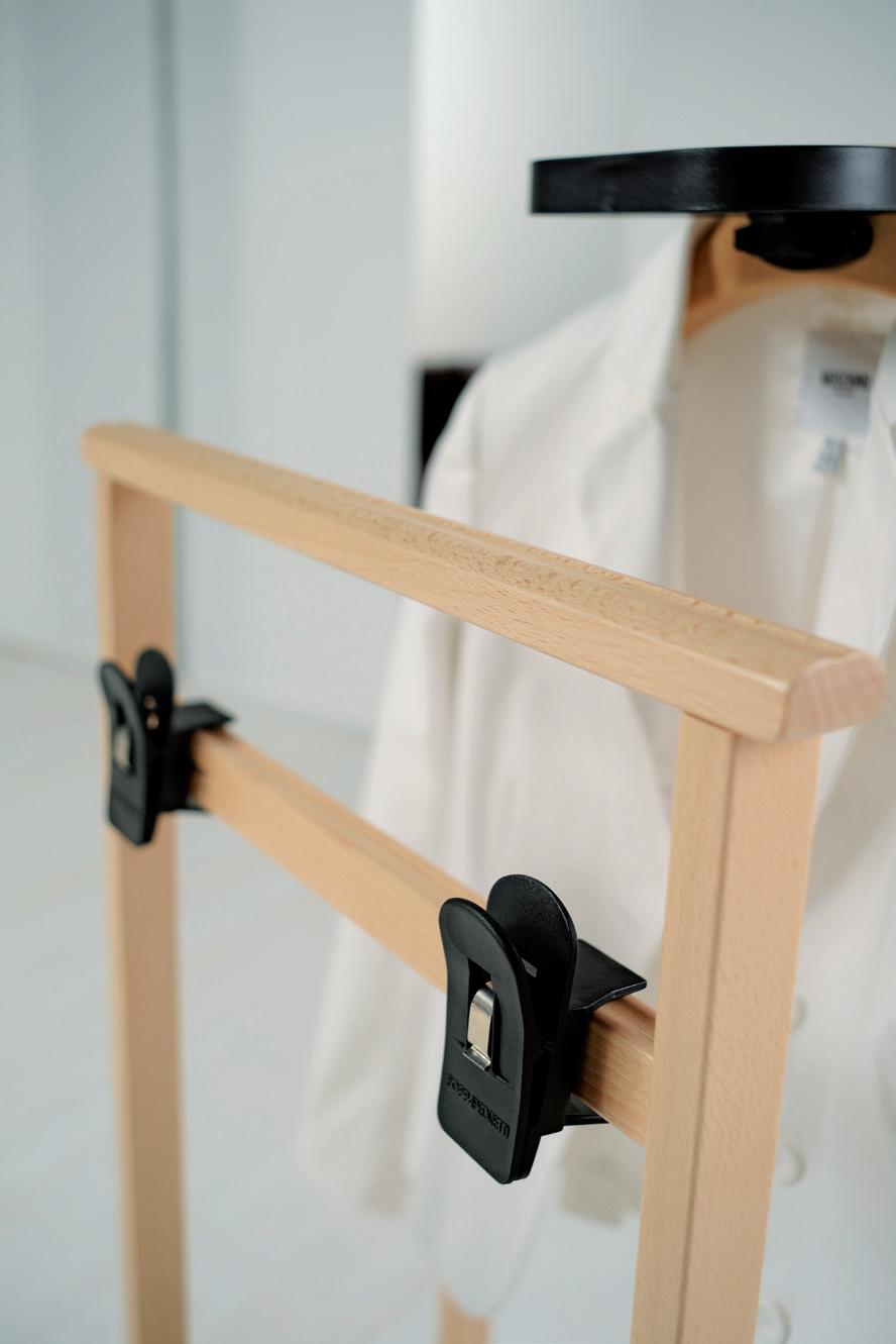 Pratica ed elegante piantana in solido legno massiccio con una barra a scomparsa che si estende fino a 80 cm. Dotata di 7 robusti pomoli in legno con profilo antiscivolo, di uno specchio e 2 ganci cromati. È indispensabile quando ci sono molti ospiti per appendere cappotti e giacche. Utile anche quando si stira.