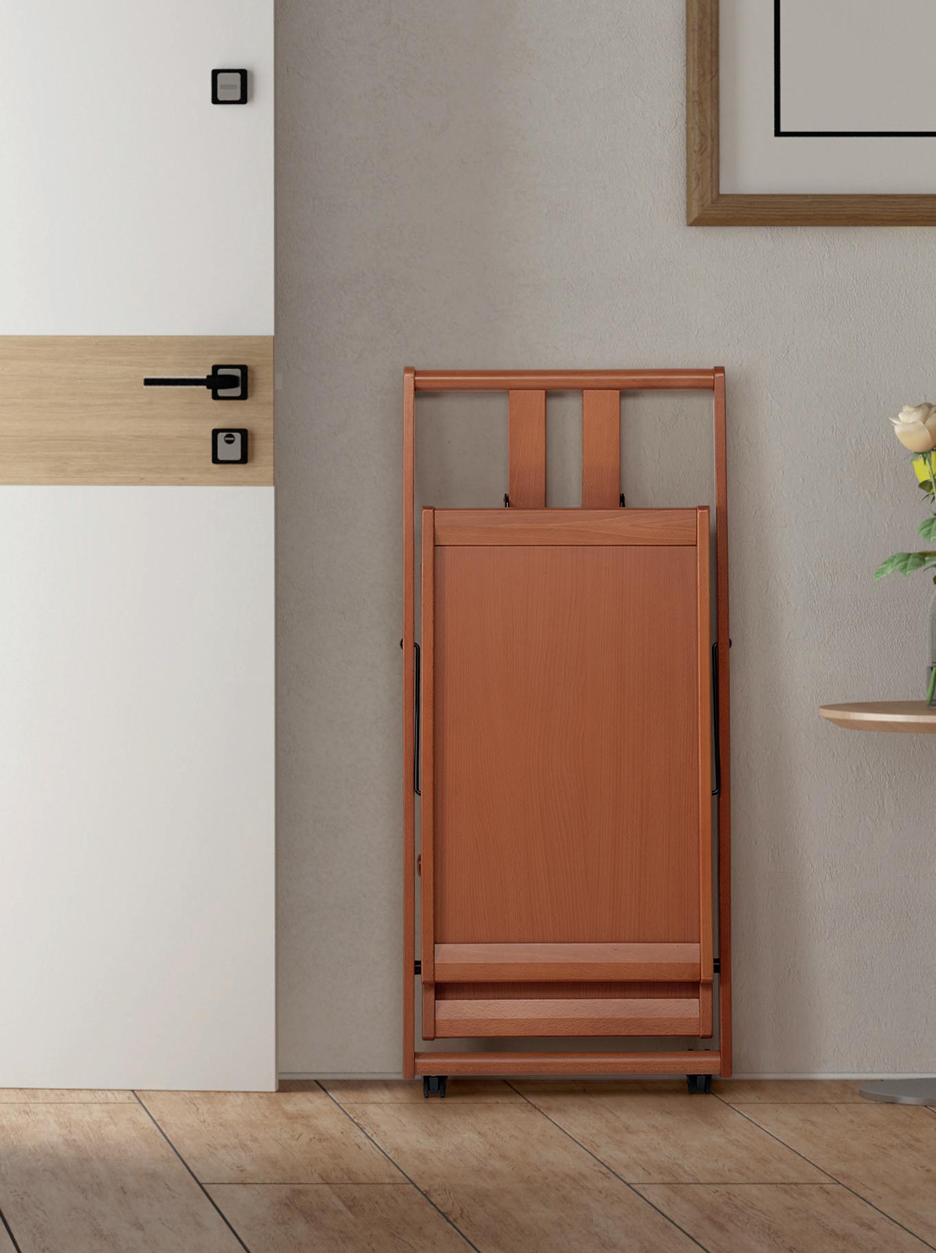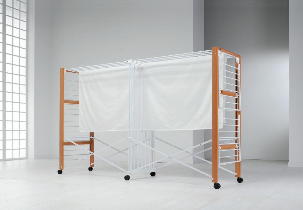 Folding clotheshorse with solid wood structure, the central rack can be placed in the middle or at the top to hang sheets or bulky laundry. Independent side racks can be tilted and folded out even partially. Features 4 castors (2 with brakes) for manoeuvrability. It has 33 meters of drying line space. It folds up completely to just 18 cm thick when not