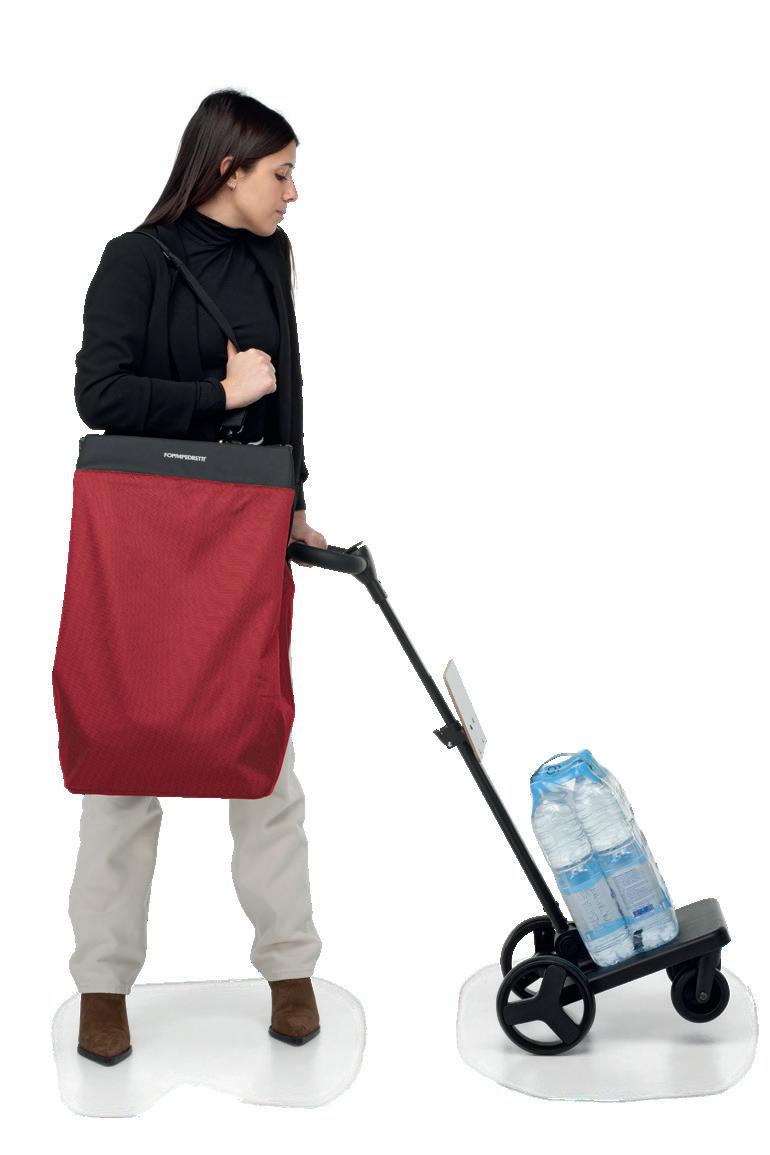 Washable shopping trolley, easy to carry also on steps. Main bag with 38-litre capacity and thermal bag with 6-litre capacity. Adjustable handle with anti-slip grip, side reflectors, lightweight frame, sturdy and resistant.