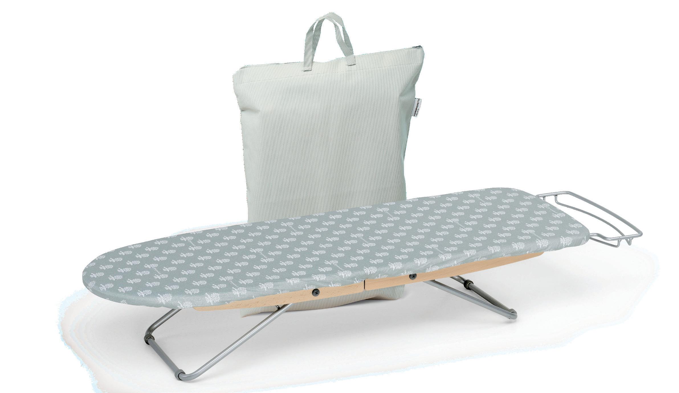 Folding table-top ironing board, solid top with breathing holes, fitted with iron grid, hook for hanging it. Carrier bag included.