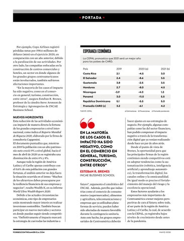 hacer ajustes en sus estrategias de negocio. Por ejemplo, algunas compañías como las del sector financiero, han podido compensar el impacto negativo a través de la transformación digital que ya venían realizando desde hace un par de años atrás. Desde el punto de vista de Brenes, la oportunidad para que las principales firmas de la región continúen siendo competitivas está en adoptar tendencias como la automatización (robótica, inteligencia artificial y aprendizaje automático), la transformación digital, los canales online y la omnicanalidad. De igual modo es preciso el fortalecimiento del manejo del riesgo y la excelencia operacional. Estos factores ayudarán a los empresarios más importantes de Centroamérica a tener mejores perspectivas de cara al futuro; sobre todo, al ser parte de la región de América Latina y el Caribe, la cual, de acuerdo con la CEPAL, ya registraba bajos niveles de crecimiento desde antes de la pandemia.