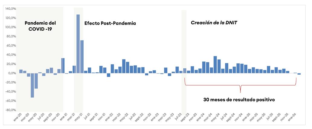 Se puede dividir en dos partes antes de la creación y posterior a la creación de la DNIT, esto es importante de resaltar a efectos de marcar que la creación fue una reforma estructural que generó un impacto en términos de recaudación tributaria. Antes de la creación, se puede mencionar que se establecieron disposiciones que ayudaron a crear un marco oportuno para la recaudación tributaria, en ese sentido se tiene la reforma del 2004, en el 2012 la implementación del Impuesto a la Renta Personal (IRP), en el 2013 la introducción del Impuesto al Valor Agregado (IVA) agropecuario, 2015 aumento del Impuesto Selectivo al Consumo (ISC) al tabaco y en el 2019 la implementación de la Modernización y Simplificación del Sistema Tributario, con lo cual se creó el ecosistema que terminó con la creación de la DNIT. Este periodo se caracterizó por un crecimiento de la recaudación moderada que mantuvo una presión tributaria en torno al 10%, lo cual se dio en un contexto de reforma, volatilidad y pandemia. En tanto con la creación de la DNIT, la recaudación tributaria ha mostrado una evolución positiva, sostenida principalmente por la recuperación de la actividad económica post-pandemia y mejoras en la eficiencia administrativa. En ese contexto, se puede mencionar que el crecimiento de la recaudación se dio por dos factores, por un lado, explicado por la actividad económica, y por otro lado, la gestión de la DNIT, es decir, con la implementación de los nuevos impuestos fijados en la Ley 6380, la utilización de la tecnología, tanto para los controles, como para facilitar al contribuyente los procesos dentro de la DNIT, asimismo, la implementación de la obligatoriedad de la Facturación Electrónica, el fortalecimiento de los controles en las administraciones aduaneras, el cruce de informaciones, la implementación de medidas administrativas para facilidades de pago y la ampliación de la base de contribuyentes, lograron fortalecer la institución y con esto se tuvo un crecimiento de la recau-