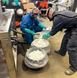 Merkittävimmät muutokset suojavarusteissa vetyperoksidiemulsiota käsiteltäessä: Moottoroidut kokokasvomaskit ABEK-P2-suodattimilla ja kemikaalisuojahaalarit.
