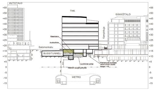 Työmaan sivuleikkauskuva, josta näkee hyvin Kampin bussitunnelin sekä metron etäisyydet kohteeseen.