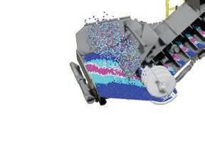 Particle simulation of the Astec Shuttle Buggy SB-3000 filling a RP-175 paver with particles colored to show lateral mixing.